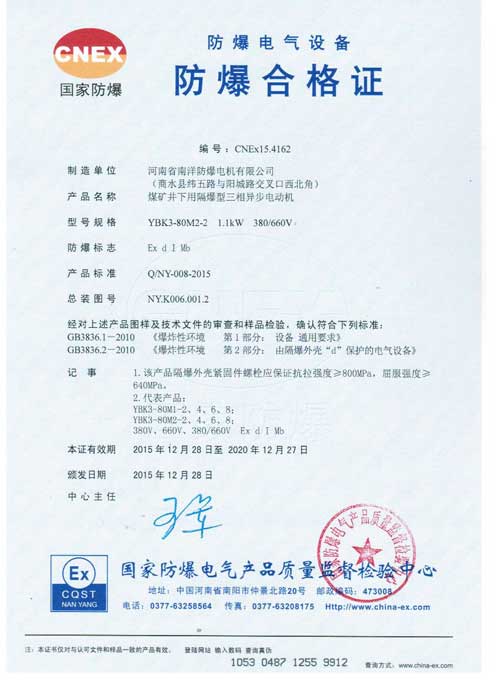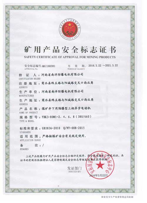 本系列電動機(jī)符合 GB755-2008《旋轉(zhuǎn)電機(jī)定額和性能》、企業(yè)標(biāo)準(zhǔn)Q/320206JLAB88-2010《YBK3系列煤礦并下用隔爆硯三相異步電動機(jī)技術(shù)條件(機(jī)座號H100-355)》。其防爆性能符合BG3836.1-2010《爆炸性環(huán)境第1部分:設(shè)備通用要求》和GB3826.2-2010《爆炸性環(huán)境第2部分:由隔爆外殼"d"保護(hù)的設(shè)備》、也符合MT451一l995《煤礦用隔爆型低壓三相異步電動機(jī)安全性 能通用技術(shù)規(guī)范》的規(guī)定,制成隔爆科ExdI適用于煤礦井下爆炸性氣體環(huán)境的危險場所。也符合IEC79-1,BS4683和EN50018的規(guī)定,制成隔爆型。防爆標(biāo)識為ExdI Mb,使用有爆炸性氣體混合物存在的場所。ExdI Mb適用于煤礦采掘工作面具有甲烷或煤塵的爆炸性混合物存在的工作環(huán)境。