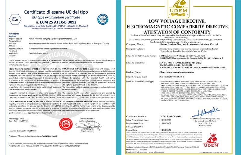 近日,河南省南洋防爆電機有限公司傳來喜訊:公司自主研發(fā)生產的防爆電機產品,順利通過權威機構的嚴格檢測與審核,正式獲得CE認證證書與ECM 25 ATEX-B D092證書。這兩項國際權威認證的取得,不僅標志著南洋防爆電機的產品質量、安全性能達到了國際標準,也為企業(yè)進一步拓展海外市場奠定了堅實基礎。